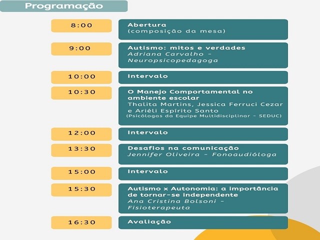 - 10h30: O Manejo Comportamental no Ambiente Escolar/ Thalita Martins, Jessica Ferruci Cezar e Ariéli Espírito Santo (Psicólogas da Equipe Multidisciplinar - Seduc);