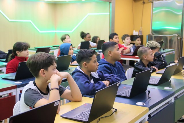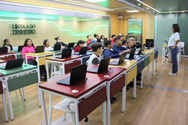 Com duração de 60 minutos, as aulas são interativas e cada aluno interage em um notebook individual com recursos online, como simuladores financeiros, vídeos e artigos que enriquecem o aprendizado.