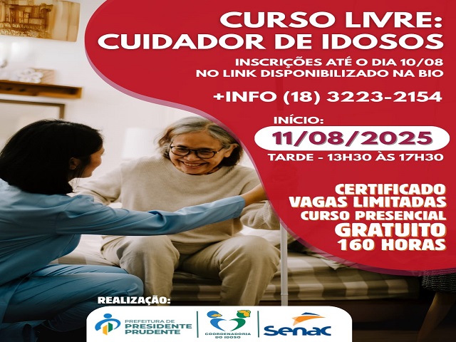 A Prefeitura de Presidente Prudente, por meio da Coordenadoria Municipal do Idoso, iniciou hoje (11/08) um novo curso livre profissionalizante de “Cuidador do Idoso”, em parceria com o Senac. Foram preenchidas as 35 vagas disponíveis, e há também uma lista de espera. A abertura contou com a presença da secretária de Assistência Social, Ariane Jacintho, e o coordenador municipal do Idoso, Caio Marcelo Neves Damato.