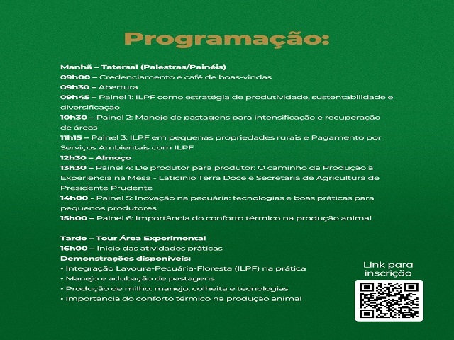 No período da tarde, haverá um tour pela área experimental, com demonstrações práticas de integração lavoura-pecuária-floresta na prática, manejo e adubação de pastagens, produção de milho: manejo, colheita e tecnologias, conforto térmico aplicado na produção animal.