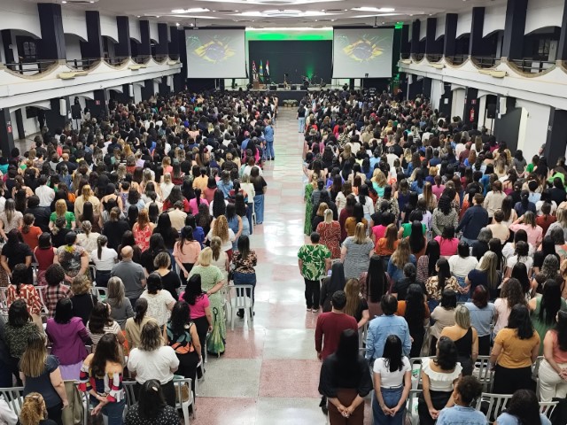 O encontro contou com a presença dos professores da rede municipal de ensino e compartilhadas, 1.579 ao todo, para a celebração da data, que contou com a apresentação do Maestro Marcelo Torres e Banda.