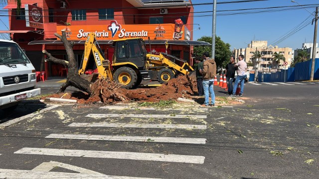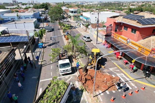 Após a retirada das árvores, as equipes realizarão o nivelamento do solo e a aplicação de massa asfáltica, restabelecendo a segurança e o fluxo de veículos na avenida.