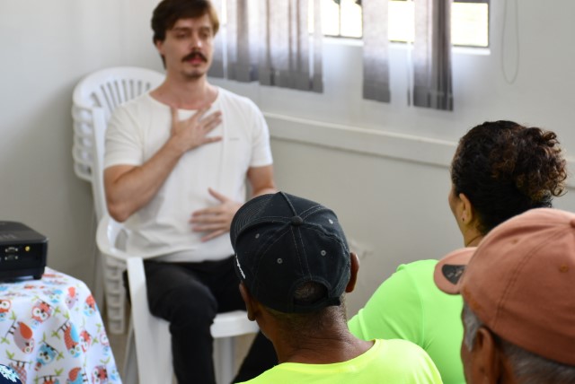 Durante o encontro, Thiago Peixoto, psicólogo da UBS Brasil Novo, e Carolina Benício, assistente social da unidade, conduziram atividades práticas de autorregulação e relaxamento, com orientações sobre como controlar o estresse e fortalecer a saúde mental no dia a dia.