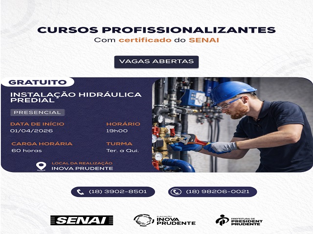 Estão abertas as pré-inscrições para os cursos gratuitos de Técnicas para Pintura Predial e Técnicas para Montagem de Sistemas Hidráulicos Prediais, marcando a retomada da parceria entre a Fundação Inova Prudente e o Senai. Ambos possuem carga horária de 60 horas e os interessados podem se candidatar pelo formulário ou realizar a inscrição pessoalmente na Inova Prudente.