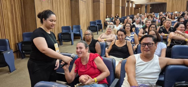 A programação teve início com a abertura, seguida por um momento de integração, conduzido pelo professor Douglas, promovendo acolhimento e bem-estar aos participantes. Na sequência, a Equipe de Nutrição conduziu um quiz sobre boas práticas na alimentação escolar, estimulando a participação ativa e a troca de experiências entre os profissionais.