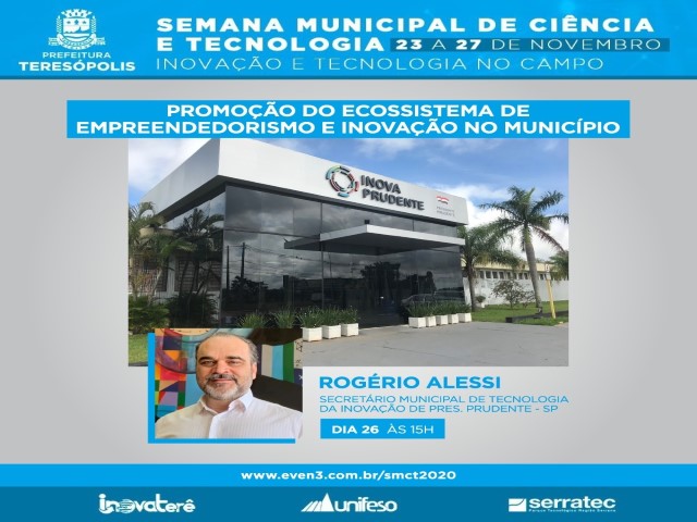 Na quinta-feira (26/11), às 15h, a Semana Municipal de Ciência e Tecnologia de Teresópolis, no Rio de Janeiro, trará como pauta as ações e projetos que têm sido realizados pelo Inova Prudente. A Fundação será apresentada no evento como um dos cases de sucesso relacionado à tecnologia e inovação. O presidente curador e secretário de tecnologia, Rogério Alessi, participará por meio de videoconferência.