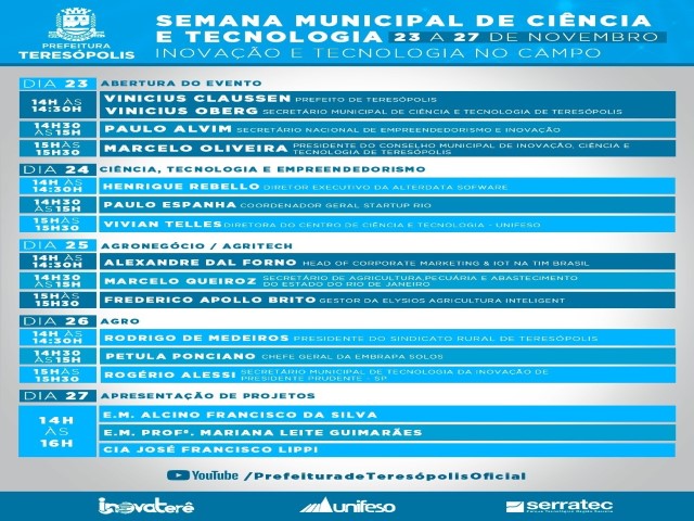De acordo com informações do Secretário Municipal de Ciência e Tecnologia de Teresópolis, Vinicius Oberg, essa é a primeira edição da Semana, idealizada a partir da criação da Política Municipal de Ciência e Tecnologia, com a aprovação da Lei Municipal de Inovação.