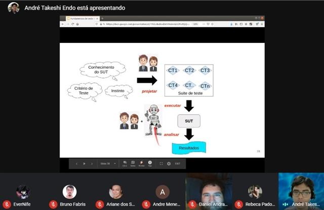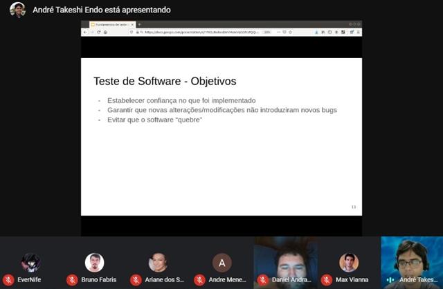 Durante o encontro, Endo abordou as finalidades de um teste de software. Estabelecer confiança no que foi implementado, garantir que novas atualizações não gerem bugs e evitar que o software quebre foram algumas das orientações repassadas por ele.