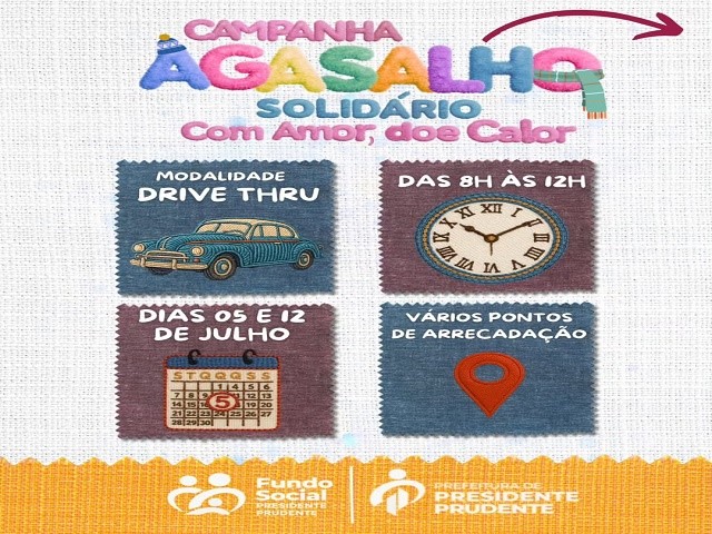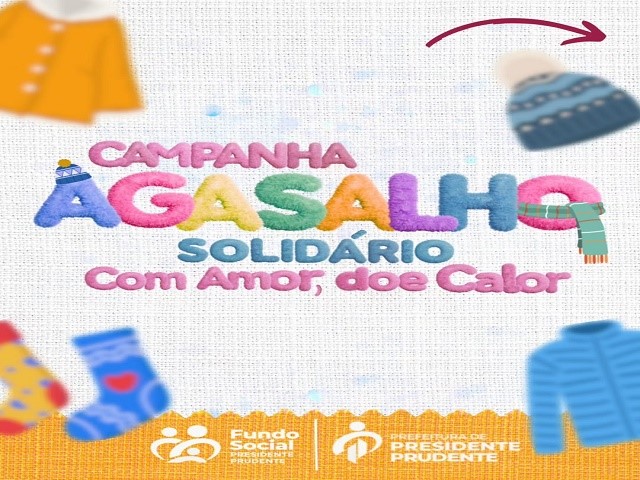 A Prefeitura de Presidente Prudente, por meio do Fundo Social, anuncia o 1º mutirão da Campanha Agasalho Solidário 2025 - Com Amor, Doe Calor, que será realizada neste sábado, dia 05 de julho de 2025, das 8h às 12h, em 14 pontos de arrecadação simultâneos.