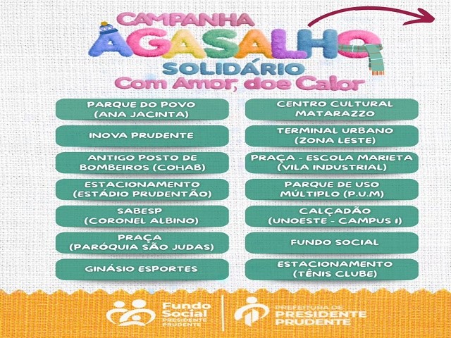 A Prefeitura de Presidente Prudente, por meio do Fundo Social, realiza neste sábado, dia 05 de julho, das 8h às 12h, o 1º mutirão da Campanha Agasalho Solidária 2025 - Com Amor, Doe Calor.