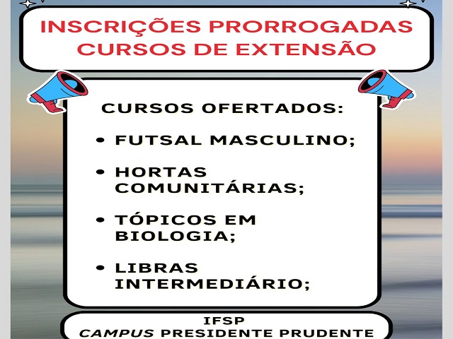 O IFSP (Instituto Federal de Educação, Ciência e Tecnologia de São Paulo), campus de Presidente Prudente, informa que há vagas abertas para cursos de extensão: futsal masculino; hortas comunitárias; tópicos em biologia básica para o ensino médio; e libras intermediário - módulo II.