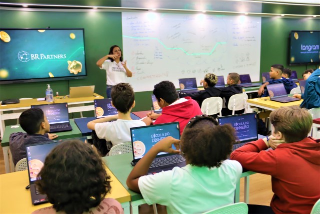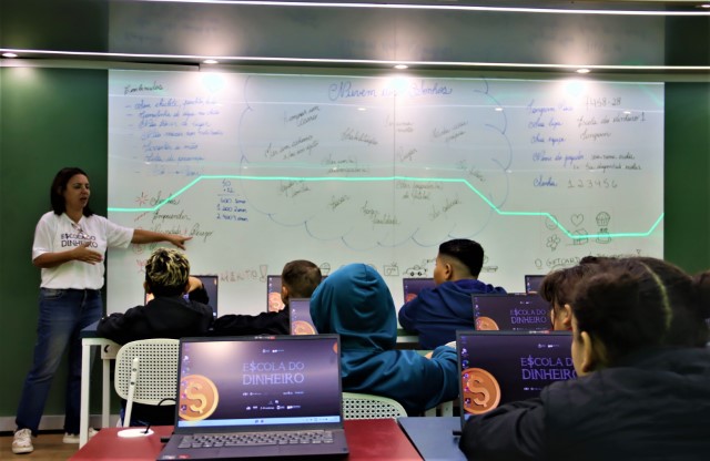 Com duração de 60 minutos, as aulas são interativas e cada aluno interage em um notebook individual com recursos online, como simuladores financeiros, vídeos e artigos que enriquecem o aprendizado.