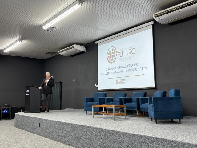 Na sequência da programação, foi feita apresentação do Observatório do Futuro, uma iniciativa do TCE/SP para acompanhamento das metas e objetivos da Agenda 2030 nos municípios, e como ela se integra as 7 dimensões do IEG-M, que foi feita pelo auditor fiscal do TCE/SP, Francisco Carlos Grancieri.