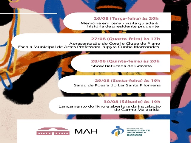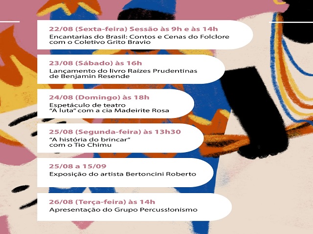 Na segunda-feira (25/08), às 13h30, “História do Brincar” com tio Chimu. Entre os dias 25/08 e 15/09 haverá Exposição do artista Bertoncini Roberto. No dia 26/08, às 14h, apresentação do Grupo de Percussionismo; ainda no dia 26/08, às 20h, haverá uma Visita Guiada à História de Presidente Prudente: “Memória em Cena”.