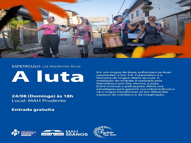 As atividades seguem: no sábado (23/08), às 16h, lançamento do livro Raízes Prudentinas, de Benjamin Resende. No domingo (24/08), às 18h, espetáculo de teatro “A Luta”, com a Cia. Madeirite Rosa.