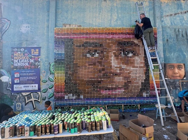 Os alunos da Oficina de Grafite do Serviço de Fortalecimento de Vínculo - Projeto Aquarela, que integra a Prefeitura de Presidente Prudente, por meio da Secretaria de Assistência Social (SAS), concluíram a montagem de um grande mosaico, elaborado com cinco mil latas de aerossol, coordenado pelo professor Itamar Xavier. O feito conquistou a marca de Maior Mosaico de Latas de Aerossol do Brasil pelo RankBrasil. O recorde foi homologado nesta quarta-feira (20/08), conforme publicação no site oficial.
