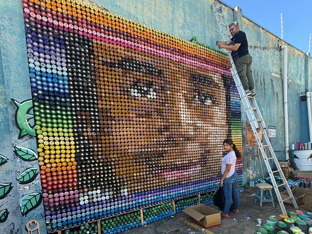 Conforme o professor, as latas de aerossóis foram arrecadadas ao longo de dois anos, por cerca de 100 alunos do Aquarela, com idades entre sete e 15 anos. O tema é o retrato da criança vencedora, Joana, responsável pela maior arrecadação de embalagens durante a campanha.