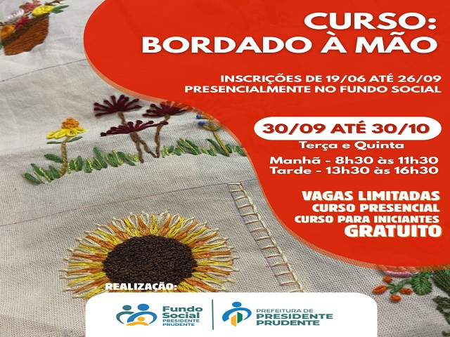 Já o curso de ‘Bordado à Mão’ será oferecido de 30 de setembro a 30 de outubro, também na sede do Fundo Social. As aulas serão realizadas as terças e quintas-feiras, nos mesmos horários: manhã (8h30 às 11h30) e tarde (13h30 às 16h30).