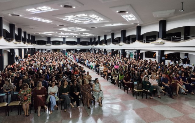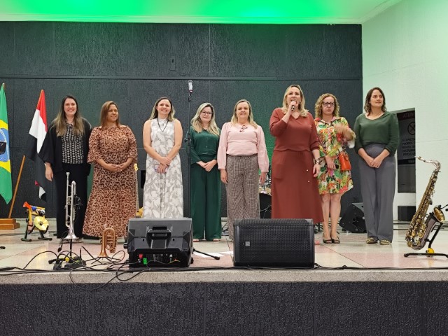 O encontro contou com a presença dos professores da rede municipal de ensino e compartilhadas, 1.579 ao todo, para a celebração da data, que contou com a apresentação do Maestro Marcelo Torres e Banda.