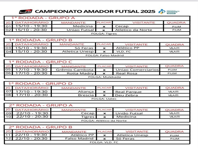 A competição prossegue nesta sexta-feira (17), com mais quatro confrontos. No Parque de Uso Múltiplo (PUM), às 19h30, jogam Grêmio Cambota x União Comerciários, e às 20h30 se enfrentam Rotta Madry x Real Rosa. No Ginásio da Vila Iti, às 19h30 jogam Aliança x Real Parque, e às 20h30 encerram a rodada Brescia Futsal x Deu Zebra.