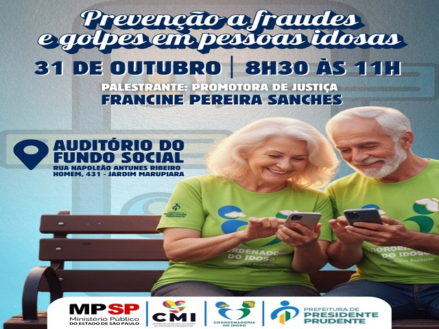 Além do seminário, a programação voltada ao público idoso se estende até o dia 31 de outubro com a palestra “Prevenção a fraudes e golpes em pessoas idosas”, que será realizada às 8h30, no auditório do Fundo Social de Solidariedade de Presidente Prudente (Rua Napoleão Antunes Ribeiro Homem, 431, Jardim Marupiara).