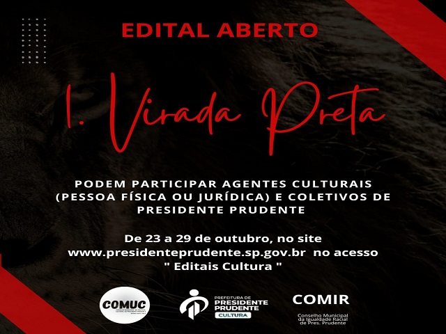 A Prefeitura de Presidente Prudente, por meio da Secretaria Municipal de Cultura (Secult), lançou o Edital de Fomento Nº 07/2025, que selecionará cinco projetos culturais voltados à valorização da cultura negra e das matrizes africanas. A iniciativa integra a programação da “Virada Preta”, que será realizada nos dias 19 e 20 de novembro, em celebração ao Mês da Consciência Negra. As inscrições estão abertas a partir desta quinta-feira (23).