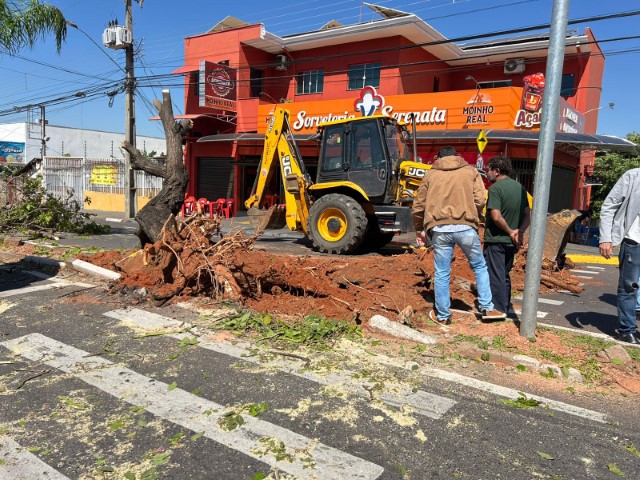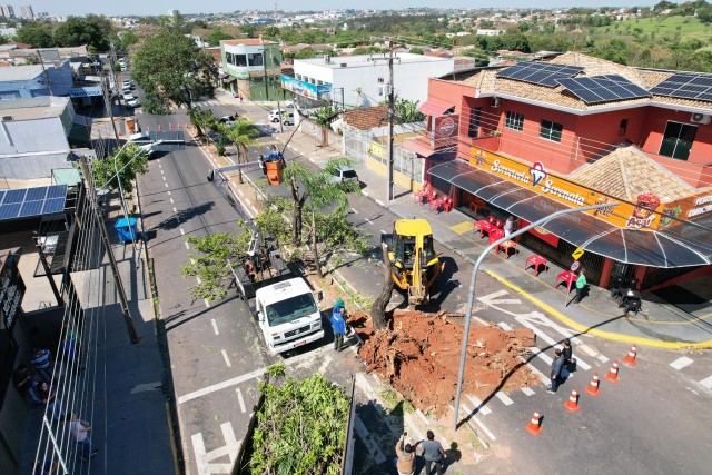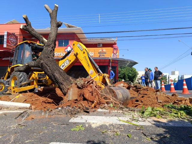 Após a retirada das árvores, as equipes realizarão o nivelamento do solo e a aplicação de massa asfáltica, restabelecendo a segurança e o fluxo de veículos na avenida.