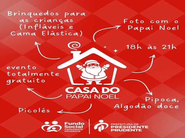 A Prefeitura de Presidente Prudente informa que a tradicional Chegada do Papai Noel, prevista inicialmente para sábado (13), no Chalé do Parque do Povo, foi adiada em função das fortes chuvas registradas nos últimos dias, sendo remarcada para esta quinta-feira (18/12) a partir das 18h.