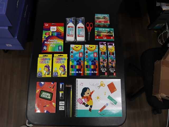 O kit da educação infantil é composto de 14 itens: uma agenda escolar, dois apontadores com depósito, duas borrachas, dois cadernos de desenho com 96 folhas, um conjunto de canetas hidrográficas com 12 cores, duas colas brancas líquidas de 90 gramas, um conjunto de giz de cera com 12 cores, dois conjuntos de lápis de cor com 12 cores, dois conjuntos de lápis de cor em tons de pele com seis cores, quatro lápis grafite, duas massinhas de modelar com seis cores, um pincel nº 8, uma tesoura sem ponta e um conjunto de tinta guache com seis cores.