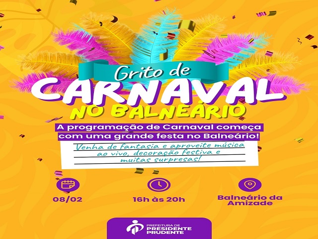 A Prefeitura de Presidente Prudente terá uma ampla programação neste mês de festejos carnavalescos. Já neste domingo (08), a Secretaria Municipal de Turismo realiza o “Grito de Carnaval”, no Balneário da Amizade. O evento será um “esquenta” para a programação do Pruden Folia 2026, que tem início na sexta-feira seguinte, dia 13 de fevereiro.