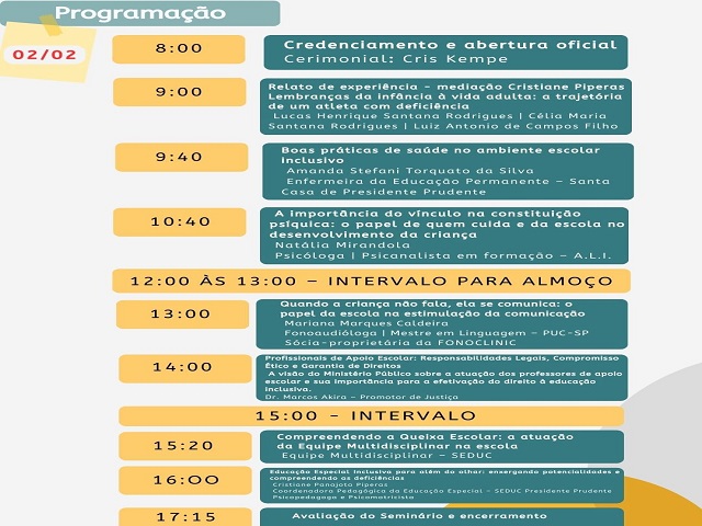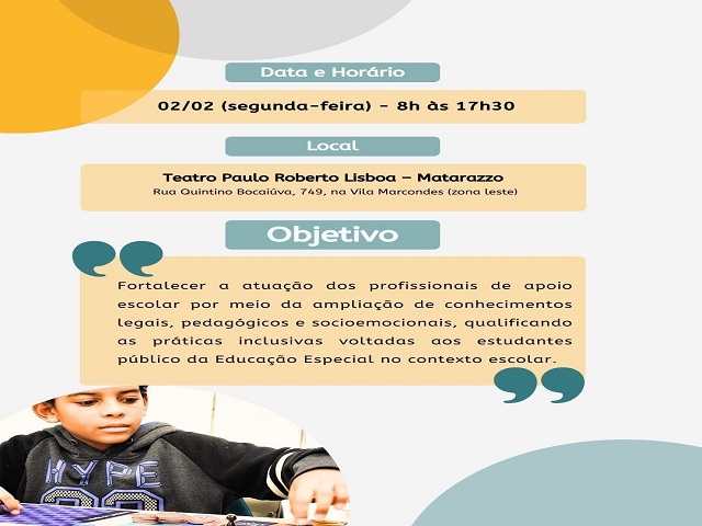 Nos dois dias de formação, o cronograma vai abordar práticas de aprendizado e reflexões, visando o compromisso com uma educação inclusiva, humana e de qualidade, valorizando o papel fundamental dos profissionais de apoio no cotidiano escolar.