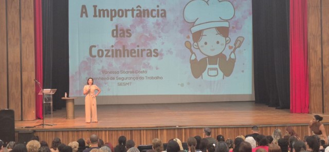A formação seguiu com orientações técnicas sobre segurança na cozinha, ministradas por Vanessa Costa, Engenheira de Segurança do Trabalho do Sesmt, reforçando cuidados essenciais para a saúde e segurança no ambiente de trabalho.