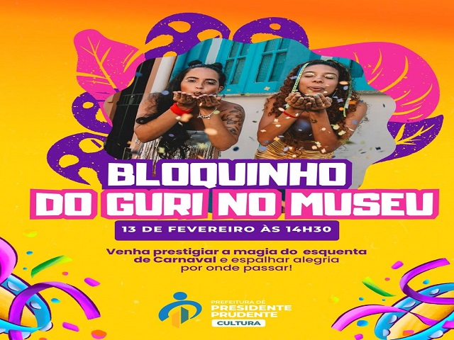 A Prefeitura de Presidente Prudente, por meio da Secretaria Municipal de Cultura (Secult), promove nesta sexta-feira, dia 13, às 14h30, o “Bloquinho do Guri”, no Museu e Arquivo Histórico ‘Antônio Sandoval Netto’