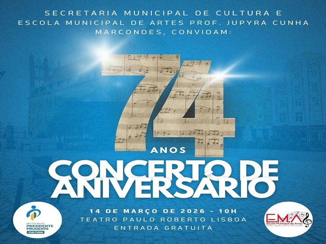 A Secretaria Municipal de Cultura de Presidente Prudente (Secult), em parceria com a Escola Municipal de Artes “Professora Jupyra Cunha Marcondes” (EMA), realiza no próximo dia 14 de março, às 10h, no Teatro Paulo Roberto Lisboa, o Concerto de Aniversário em comemoração aos 74 anos da instituição.